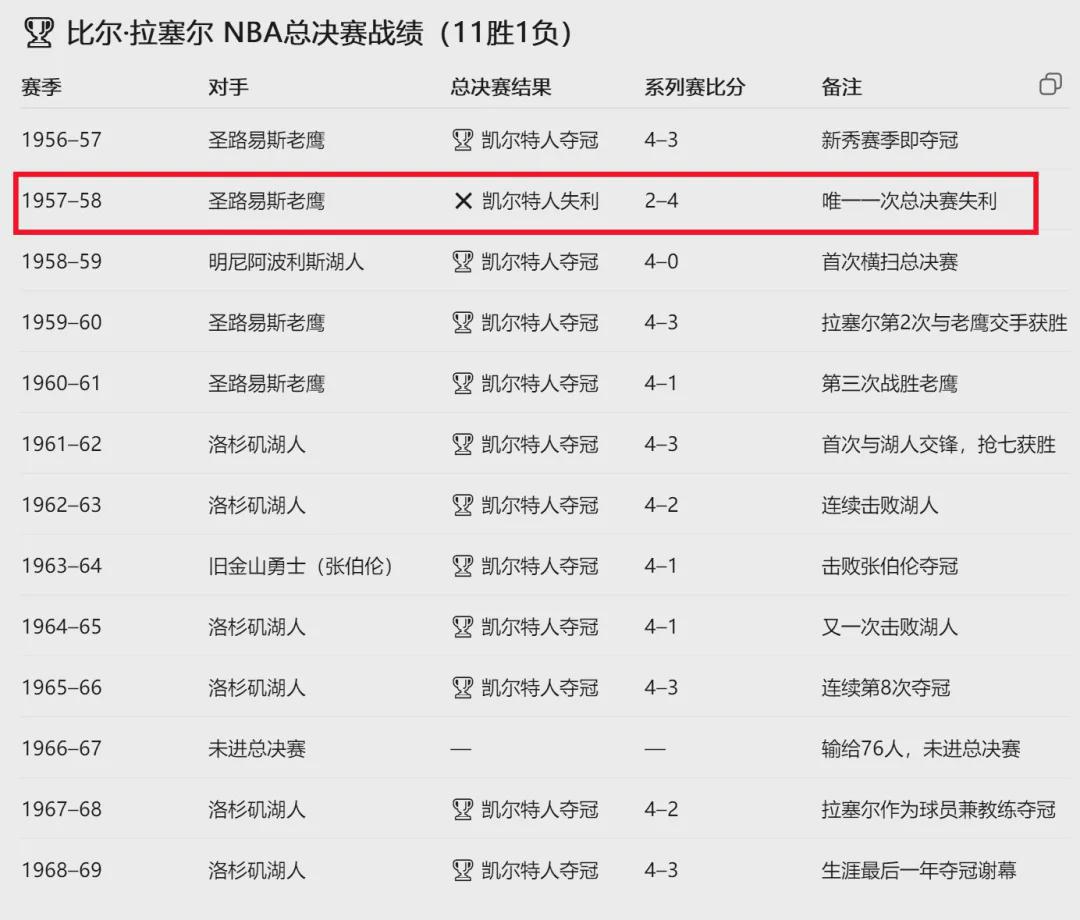 很多人觉得会有比尔-拉塞尔,事实上拉塞尔在总决赛输过一次。拉塞尔13年球员生涯,12次打进总决赛,拿到11个NBA总冠军。1957-58赛季,拉塞尔和凯尔特人不敌鲍勃-佩蒂特率领的老鹰队,这也是拉塞尔唯一的总决赛失利。