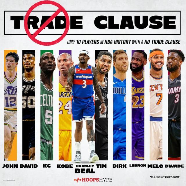NBA历史上,拥有完整交易否决权的,其实只有10人:大卫-罗宾逊、斯托克顿、诺维茨基、邓肯、科比、加内特、韦德、安东尼、詹姆斯,还有比尔。